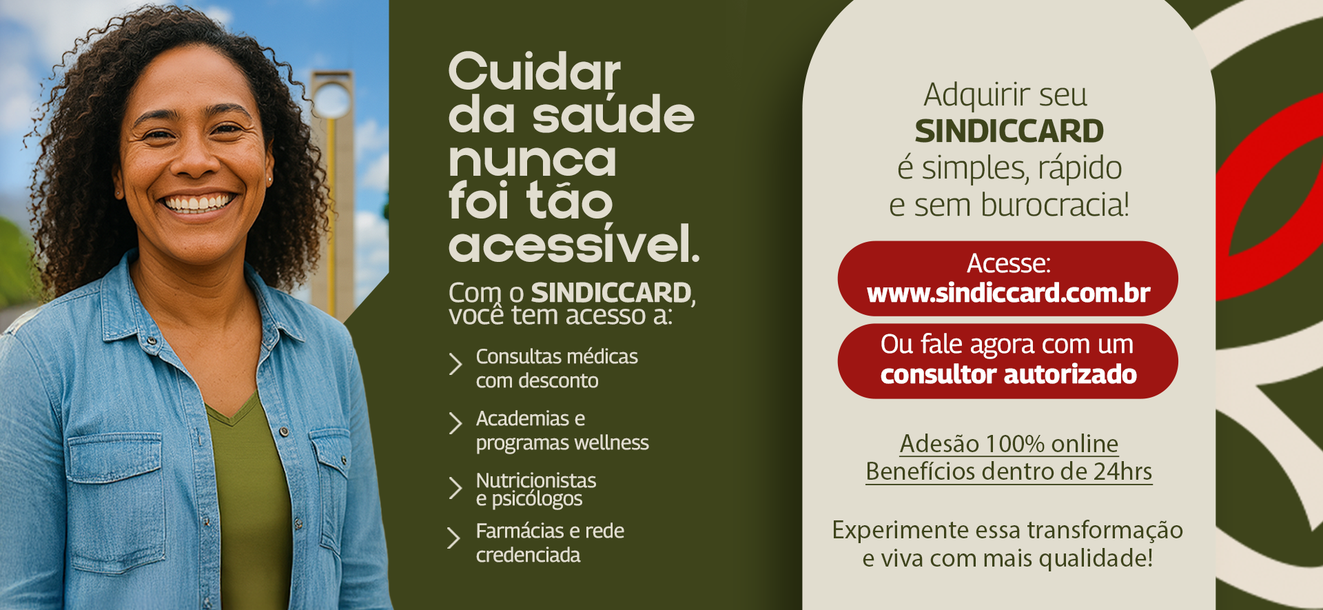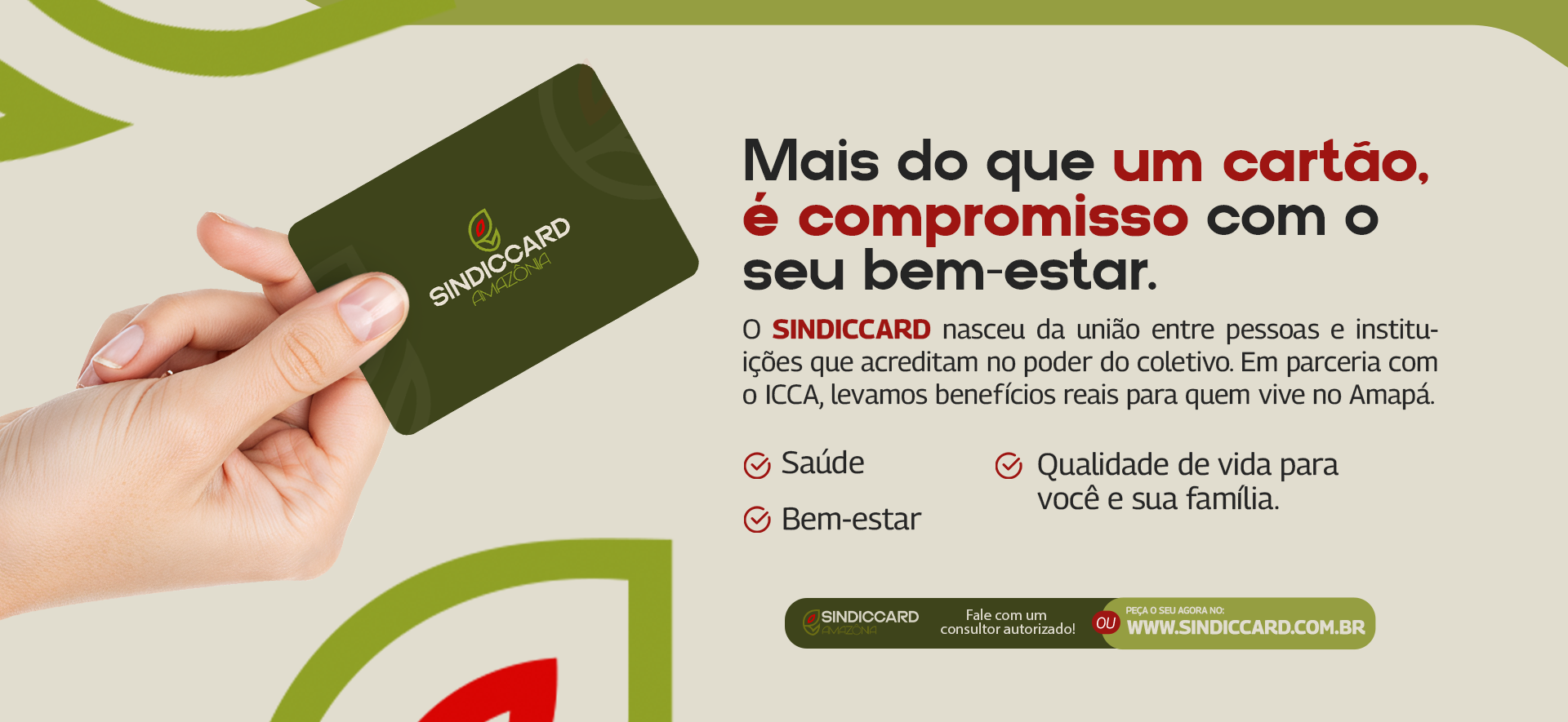 O SINDICCARD é a materialização do poder da nossa união. Em parceria com instituições de respeito como o ICCA, trabalhamos incansavelmente para trazer benefícios reais que impactam positivamente o seu dia a dia e da sua família aqui no Amapá. Mais que um cartão, é o nosso compromisso com o seu bem-estar.